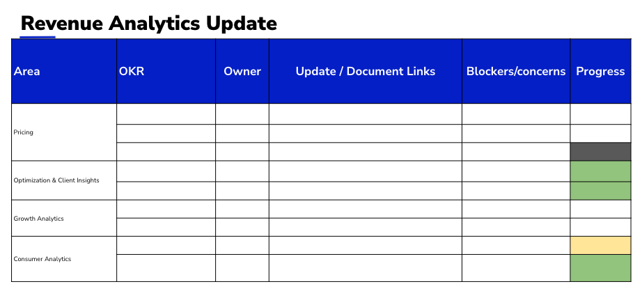 Once we have set deadline and key results in OKRs, we should always track our progress against it. I set up a weekly review template with my team leaders to collect their OKR progress every Monday morning and share that with my peers and my manager. I will check in and discuss blockers and reasons for delays if there is any.